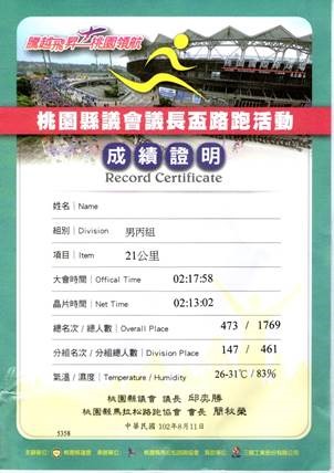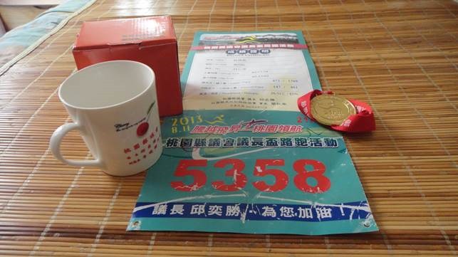 2013年8月11日桃園縣議會、桃園縣馬拉松路跑協會、以及贊助單位:三陽工業股份有限公司、桃園縣滑輪溜冰協會共同舉辦 “2013年桃園縣議會議長盃『騰越飛昇-桃園領航』路跑” ,這次報名21公里競賽組。